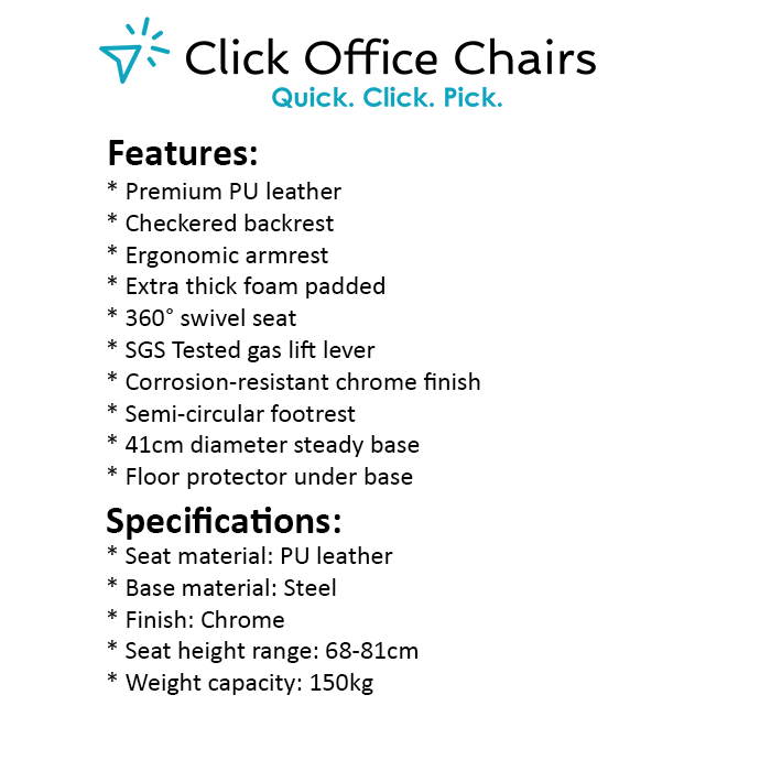 Upholstered in faux leather, the stool features an extra thick foam padding for ultimate comfort. The contoured backrest adds a touch of class to its character, and the semi-circular footrest ensures you sit totally relaxed. The omni-directional seat makes for easy turning and the height can be easily adjusted with the SGS-tested gas lift. The large base ensures stability and a floor protector under the base helps to keep your floors scratch-free.