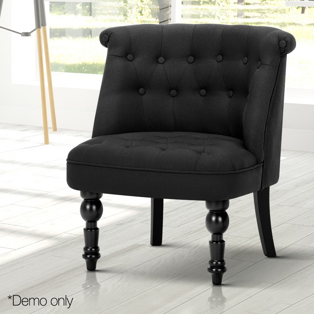 A chair full of charm and character. Reminiscent of 18th century furniture décor that graced many a provincial home in France, the Lorraine Chair is a contemporary interpretation of this period design. Updated with delicate upholstered faux linen fabric, the Chair is peppered with lovely tufted buttons on its wide arch back for a look that is both alluring and classic. The generous padded seat offers exceptional comfort whilst the intricate front legs and curved back legs provide sturdy support with artistic flair. Not least, the rubber base back legs are extremely floor-friendly. Enjoy this piece de resistance in your elegant hallway, delightful living room or perhaps right beside your bed as an exquisite reading chair. Whatever’s your fancy, the Lorraine Chair certainly deserves a hallowed place in your home.